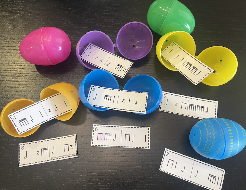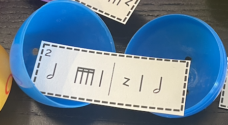 Put rhythm or melody cards in each egg like this: