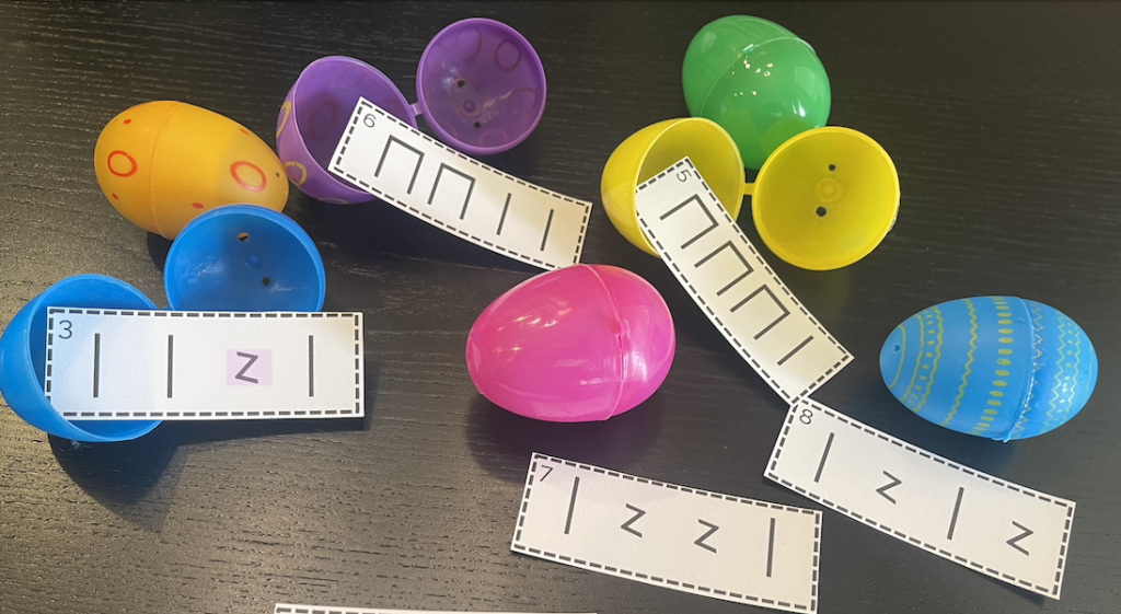 Simply leave a dozen or so eggs at each center. students can count/sing the cards inside the eggs as they open them OR they can use instruments to play a rhythm or manipulatives to draw a melody.